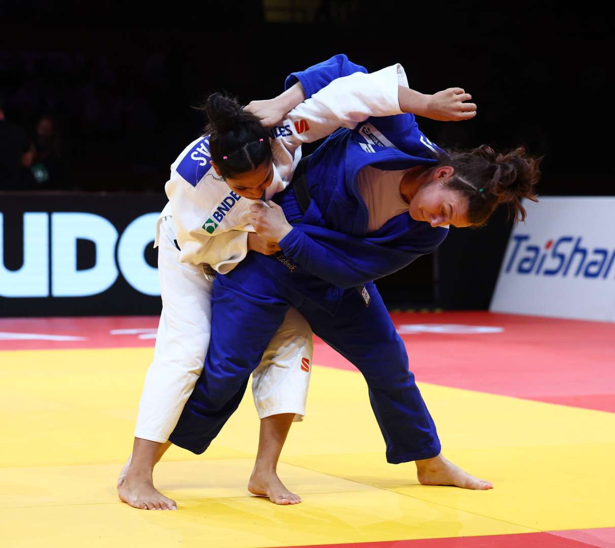 In the first of the two bronze medal contests, Beatriz Freitas (BRA) faced Metka Lobnik (SLO). Both judoka hunted scores but ultimately it was the Slovenian who exercised her full power throwing for a waza-ari with sode-tsuri-komi-goshi and then holding on the ground for the required ten seconds; a second waza-ari to end the contest and claim the bronze medal.