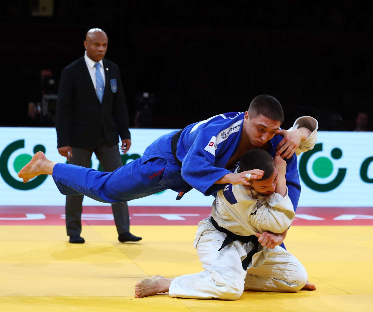 The first bronze medal went to Azerbaijan’s Omar Rajabli. He threw Ihanamaki of Finland pretty quickly after ‘hajimie’ was called. Without any break in the action, the judoka tried to turn each other over but continuous escapes and adjustments left the final result still unknown but not for very long. Still in the same exchange, Rajabli turned Ihanamaki on to his back and held him for the necessary ten seconds.