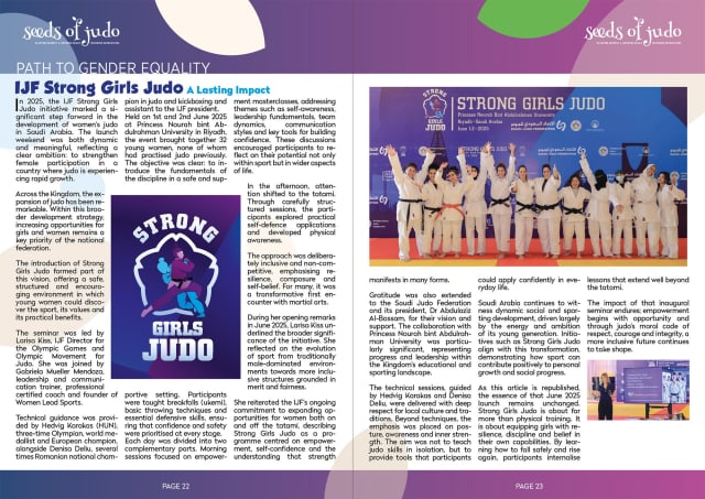 The magazine also complements another important IJF publication, The Art and Science of Judo. While that journal focuses on academic research and scientific analysis, Seeds of Judo speaks to a broader audience. It is aimed at everyone who sees judo as a powerful instrument for education, development and human connection.