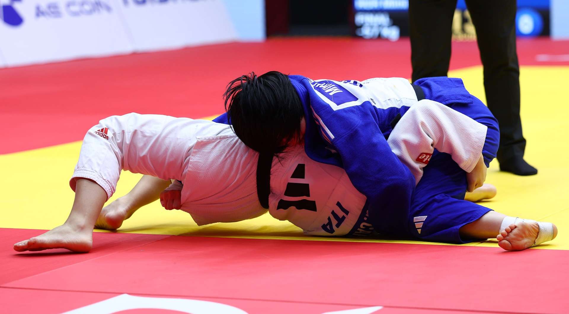 The first three minutes unfolded as a succession of seoi-otoshi attempts from both sides, none of them threatening enough to break through. The most dangerous attack came from Carna, whose more committed and better-positioned seoi-otoshi earned Mimi Huh a first shido. With the score still level and only the Korean judoka carrying a penalty, the contest moved into golden score.