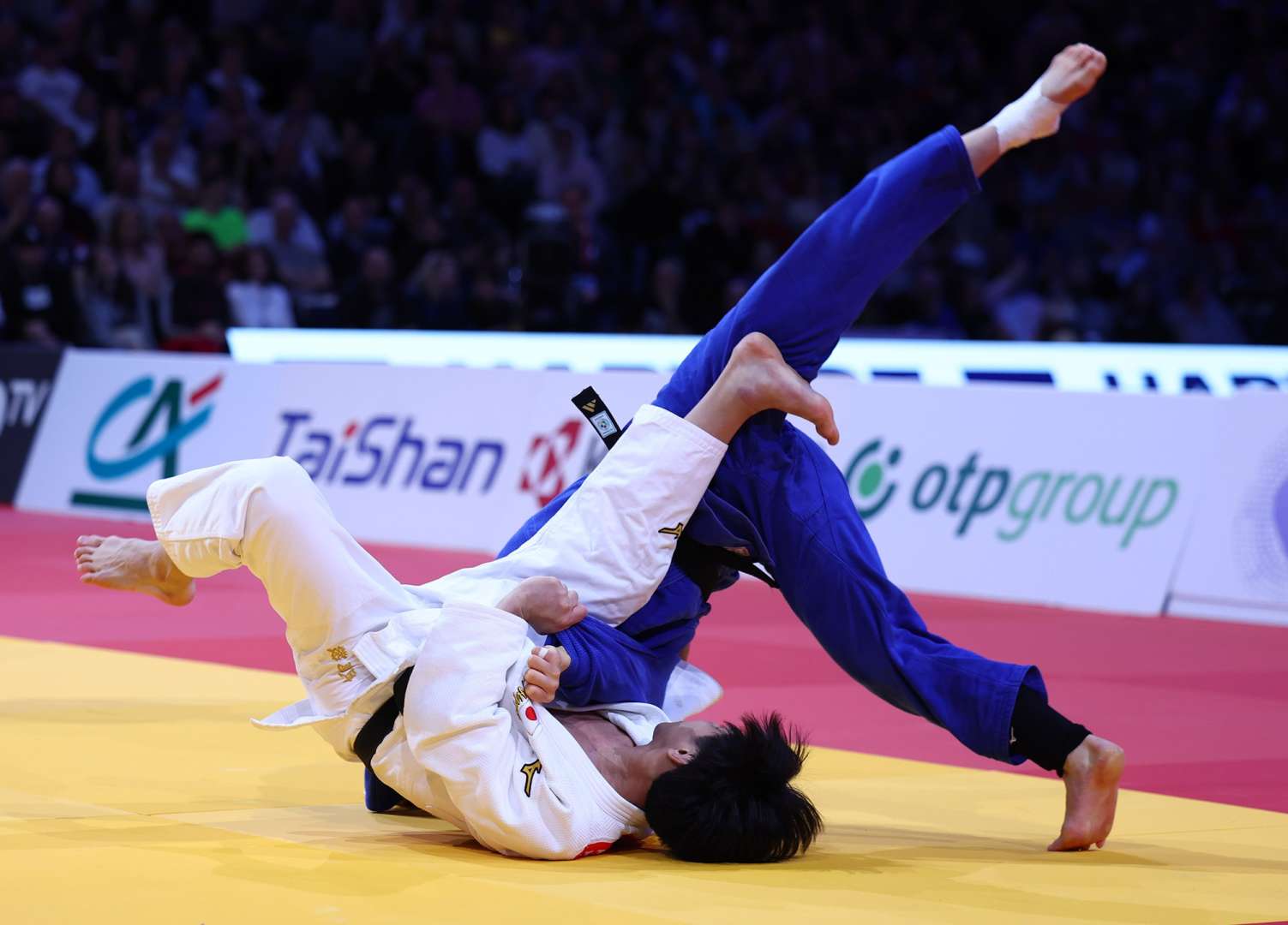 Takeoka and Channyeong Kim (KOR) walked on to the field of play for an all-Asian final under the lights of the Accor Arena Bercy. The current world champion knew it wouldn’t be as easy as his red back patch suggested and so he got down to work. However, a ko-uchi-gaeshi from Kim earned the first score of the contest. This seemed to drive Takeoka harder towards the top of the podium; his response was to accelerate and it was the right answer.