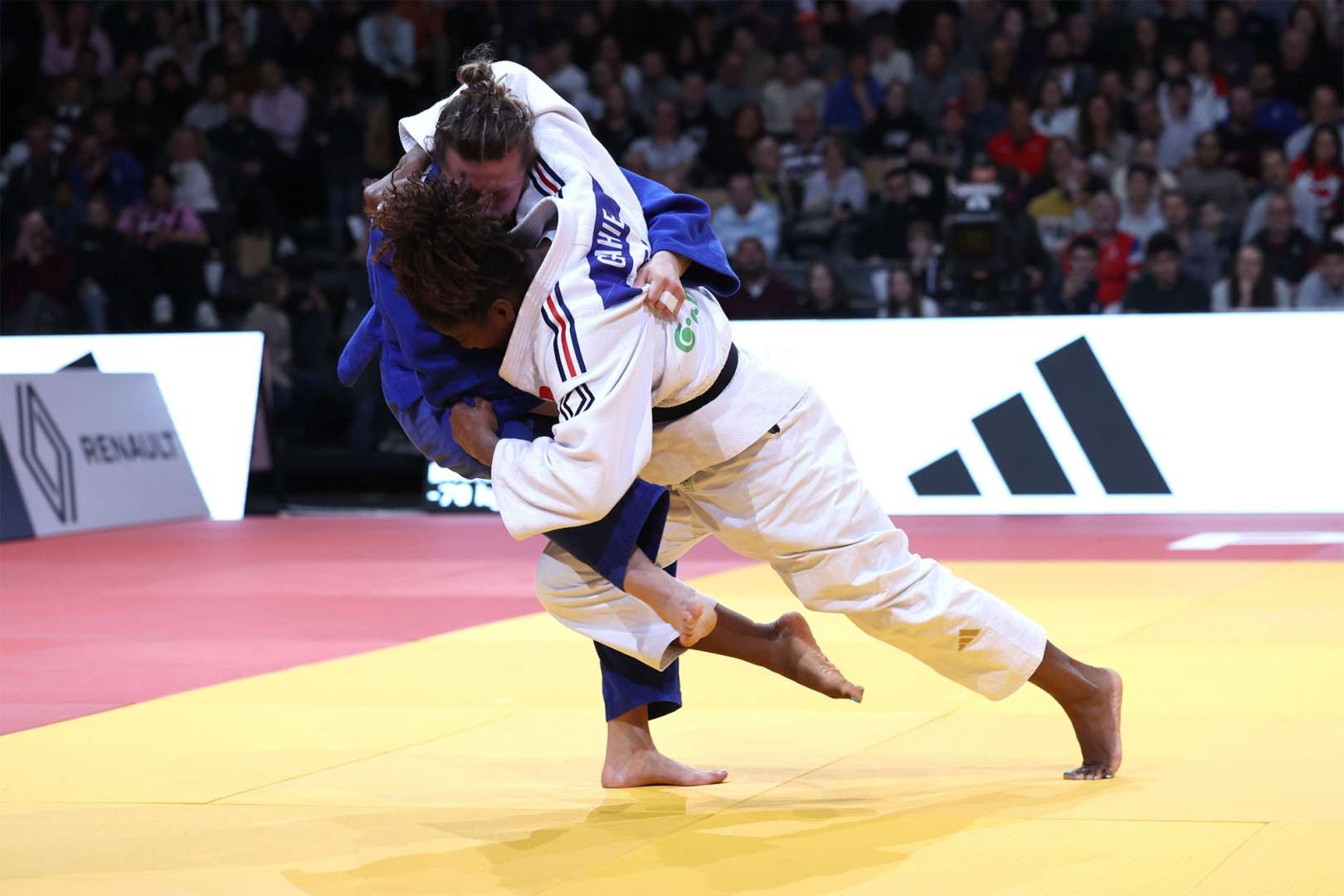 The first bronze medal was already guaranteed to stay in France as Marie-Eve Gahie, shocked earlier in the day by the Japanese starlet Mayu Honda, faced Lucie Jarrot under the watchful eyes of the thousands of spectators gathered in the Accor Arena. Gahie looked a different level, notching up a yuko and then a waza-ari before finishing the job with a low osoto-gari for another waza-ari. The two French women embraced in appreciation of what the moment meant to each of them.