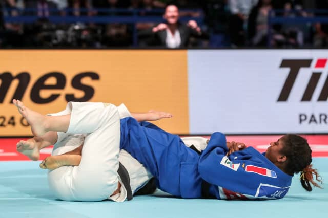GAHIE fell to her knees in celebration and the tears flowed as she left the mat and jumped into the arms of her coach before looking up and applauding the French fans who had been in good voice all day long.