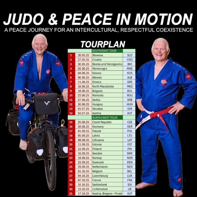 In 2025 Project 1000 took on a new dimension as Franz incorporated ‘Judo & Peace in Motion’ in the mission. "My goal is to cycle through 30 European countries visiting judo clubs along the way. This tour has two major sections. The first is the South-East tour and the second leg will be the North-West tour, which will start on 21st August."